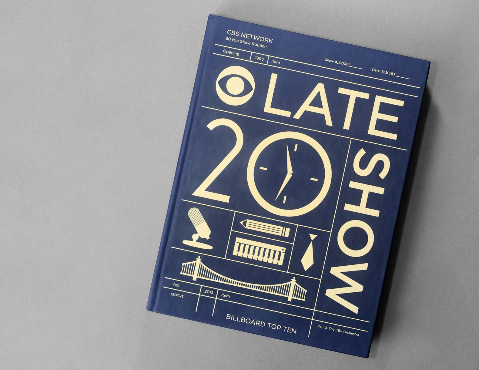 I was approached by one of the producers for the Late Show with David Letterman to design a book cover commemorating the show’s 20th anniversary. The design was inspired by iconic aspects of the show as well as the call sheets used by production.